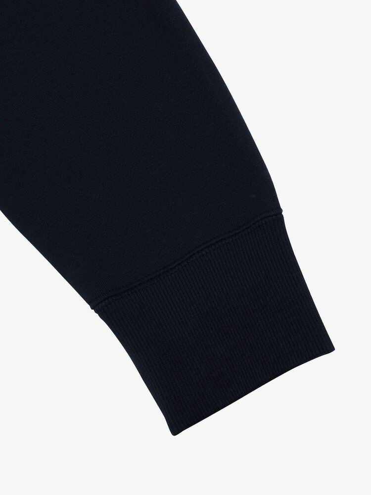 乾きやすさを考慮し、リサイクルポリエステルを混紡しています。フード部分のロゴは立体刺繍で表現。