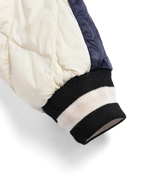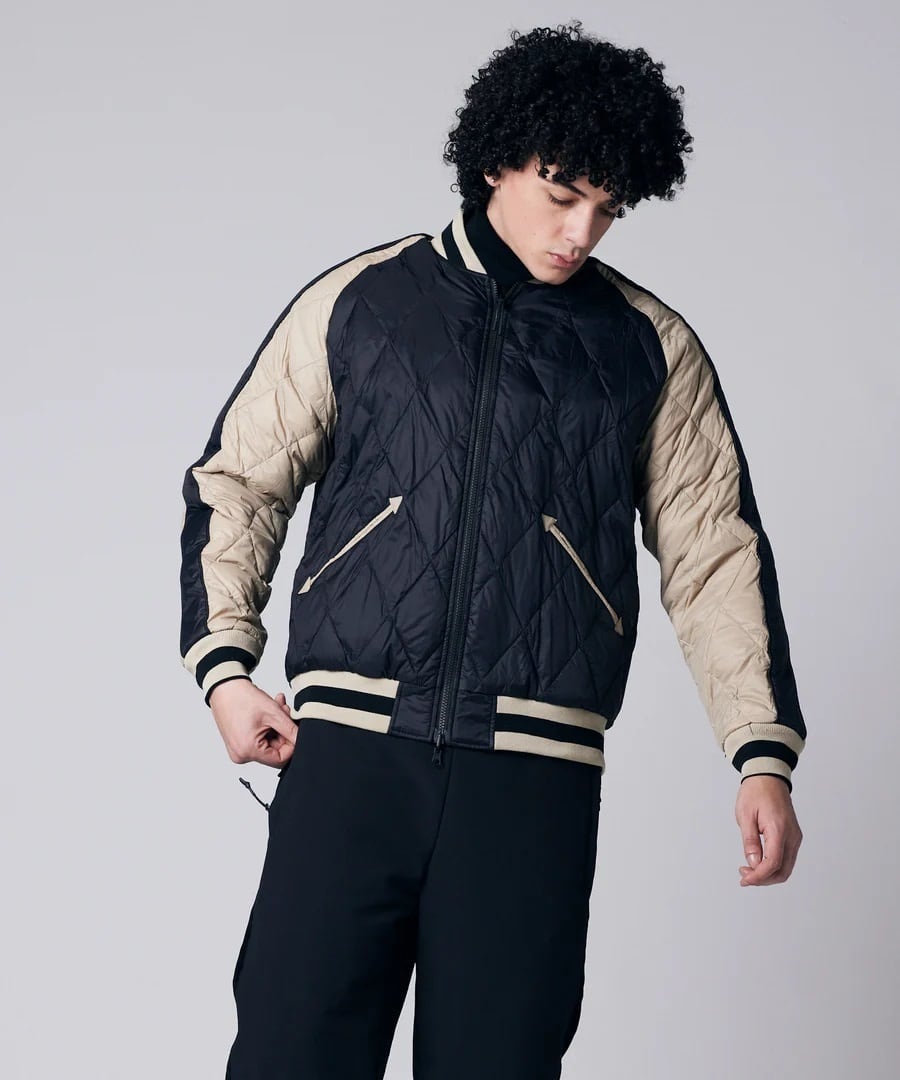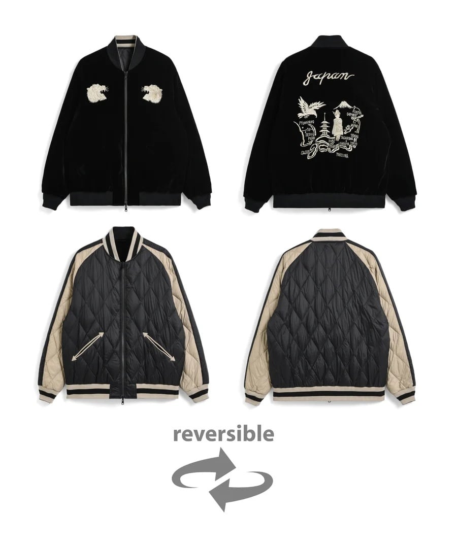 スカジャンとダウンを組み合わせた、スカジャン風リバーシブルダウンジャケット。