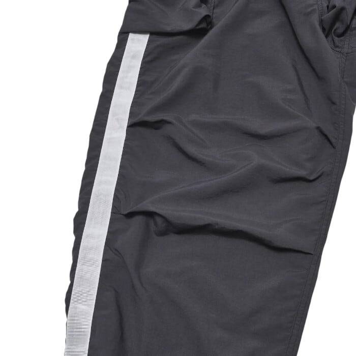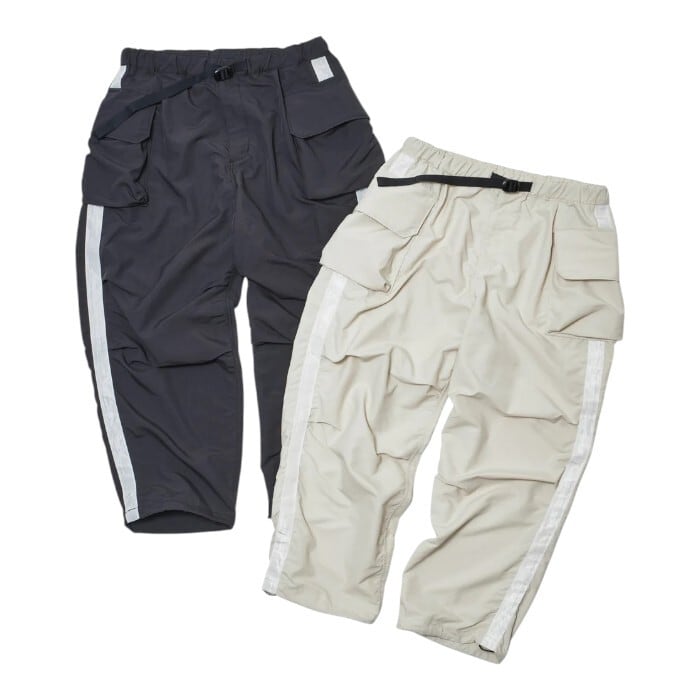9部丈のバギーシルエット、サイドのライン、膝のダーツなどWhite Lineパンツのディテールも加わったハイブリッドな仕上がり by A.M.