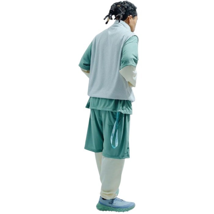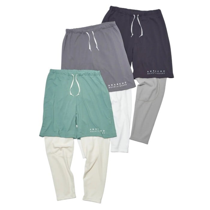 速乾天竺と速乾ワッフルを組み合わせたレイヤードパンツ。こちらはTeeとは異なる2層仕立てで、異なる素材のコントラストが映える一枚。裾にはにはA.M.プリント入り。素材は共にポリエステル。速乾性はもちろん、ライトな着心地もポイントです。