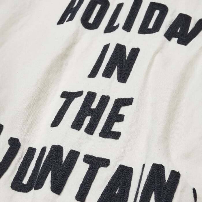 H.I.T.M.のチェーン刺繍入りのデニムワークシャツ。素材は、6ozのムラ糸デニム。糸の不均一な太さが生み出す自然な色落ちと豊かな表情が魅力の生地です。背中には ブランドスローガンの”HOLIDAY IN THE MOUNTAIN”の文字がチェーン刺繍されています。身幅を大きめに取ったワイドシルエット。単体はもちろん、軽い羽織としても様になる一枚です。