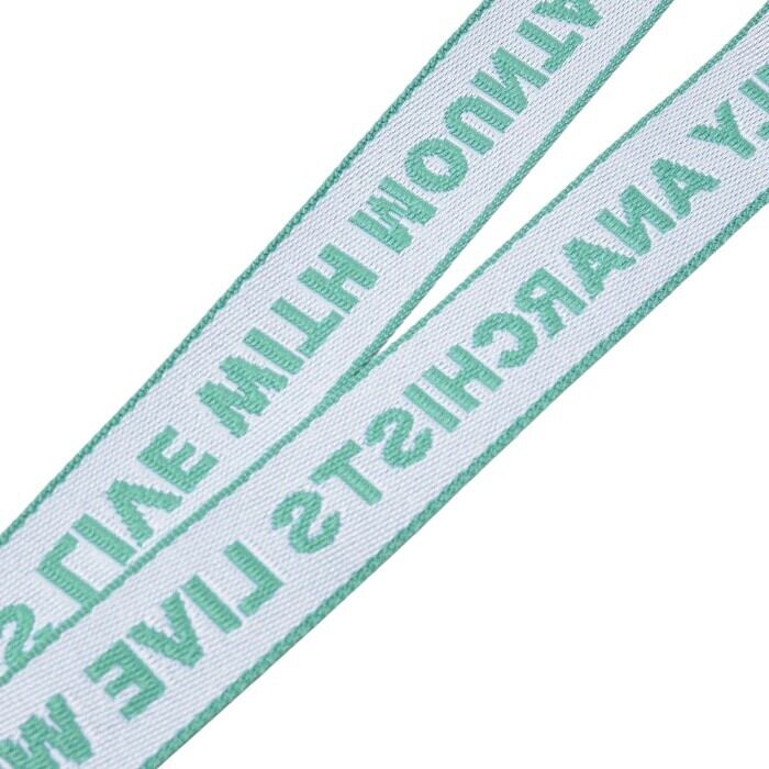 ”Only Anarchists live with Mountains”のジャガード織テープのネックストラップ。首から掛けても、ポーチに繋げても。