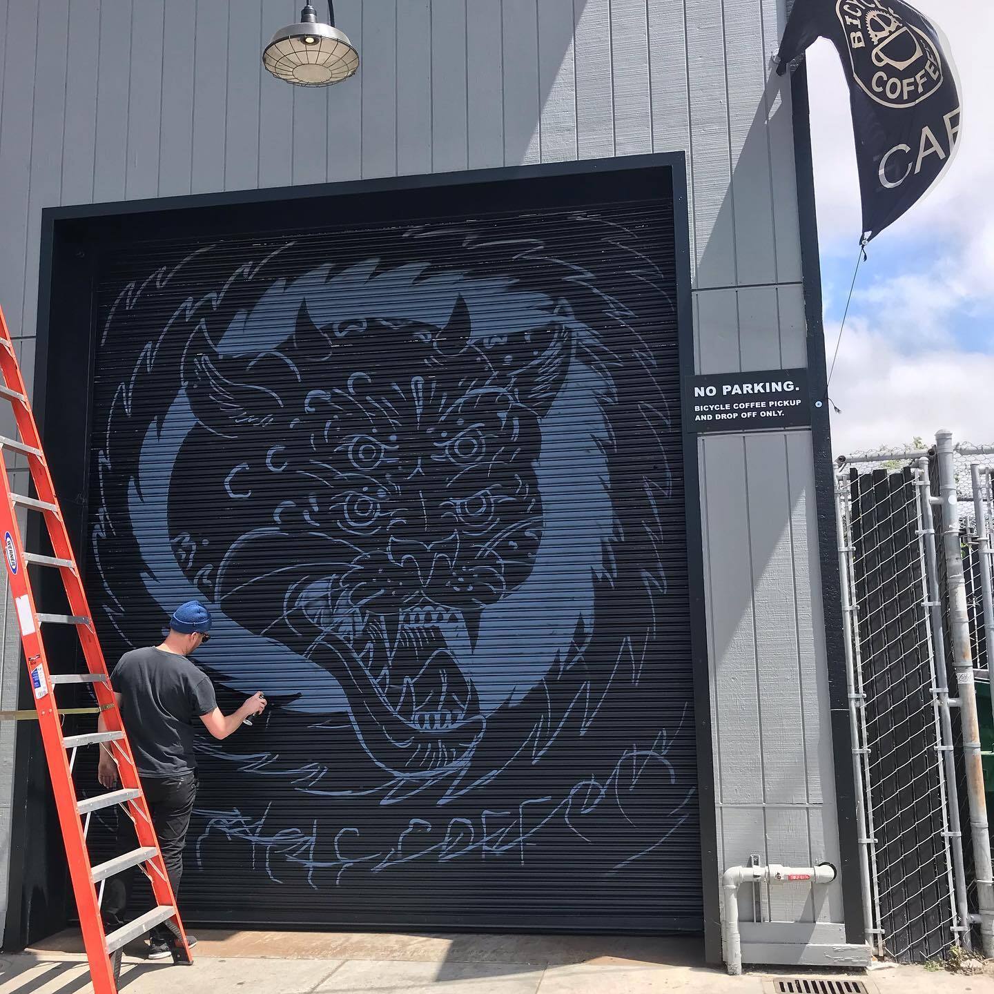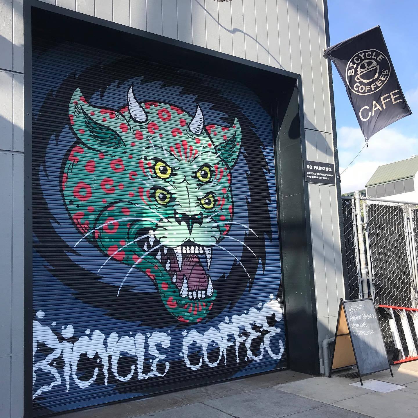 こちらはBicycle Coffeeを代表するアートワークのひとつで、旧Bicycle Coffee HQのシャッターにはこのアートワークの作品がペイントされていました。